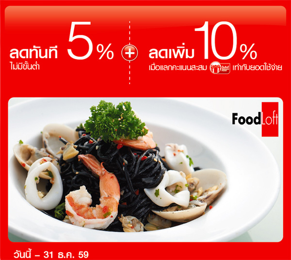 สิทธิพิเศษสำหรับสมาชิกบัตรเซ็นทรัล เครดิตคาร์ด รับส่วนลดทันที 5% เมื่อทานอาหารที่ Food Loft โดยไม่กำหนดยอดใช้จ่ายขั้นต่ำ