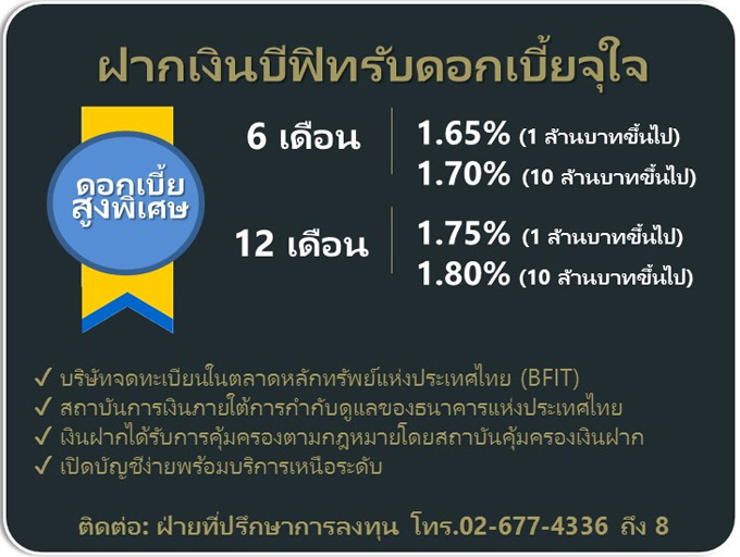 บัญชีฝากเงินบีฟิทรับดอกเบี้ยจุใจ ดอกเบี้ยสูงพิเศษ - 6 เดือน รับดอกเบี้ยในอัตรา 1.65% ต่อปี เมื่อฝาก 1 ล้านบาทขึ้นไป