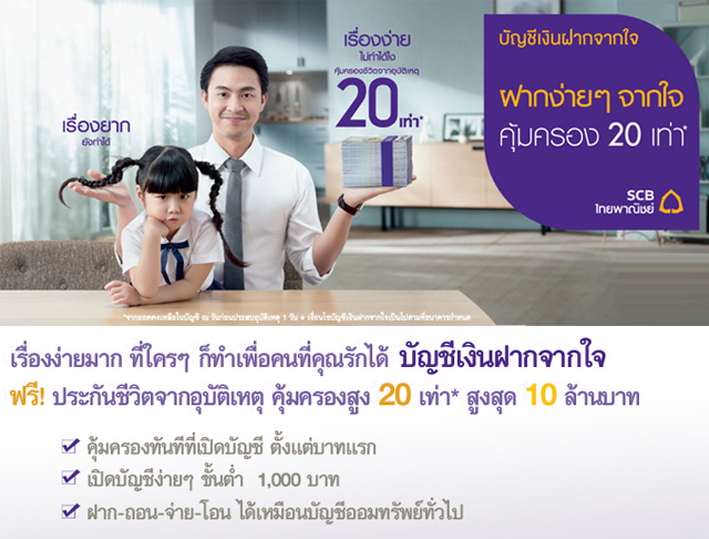 ธนาคารไทยพาณิชย์เปิดตัว "บัญชีเงินฝากจากใจ" ฝาก, ถอน, จ่าย, โอน ได้เหมือนบัญชีออมทรัพย์ทั่วไป ฟรี! ประกันชีวิตจากอุบัติเหตุ คุ้มครองสูง 20 เท่าจากยอดเงินคงเหลือในบัญชี สูงสุด 10 ล้านบาท เปิดบัญชีขั้นต่ำเพียง 1,000 บาท