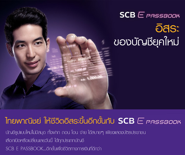 SCB E PASSBOOK บัญชีเงินฝากรูปแบบใหม่ ให้ชีวิตอิสระขึ้นอีกขั้น เพียงแสดงบัตรประชาชนก็ทำธุรกรรม ฝาก ถอน โอน จ่ายได้สบายๆ ทุกสาขาของธนาคาร ไม่ต้องพกสมุดคู่ฝาก คล่องตัว และปลอดภัยมากขึ้น