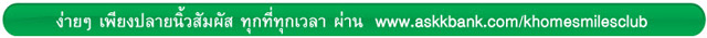 - ของสมนาคุณข้างต้นสำหรับลูกค้าสินเชื่อบ้านกสิกรไทยที่ใช้บริการ K-Home Loan Online คำนวณวงเงินสินเชื่อบ้านเบื้องต้นที่ www.askkbank.com/khomesmilesclub ระหว่างวันที่ 1 ก.พ. 59 - 31 มี.ค. 59 โดยกรอกข้อมูลครบถ้วนถูกต้องตามความเป็นจริงเท่านั้น ทั้งนี้ต้องได้รับวงเงินอนุมัติและยื่นจดจำนองหลักประกันกับธนาคารภายใน 15 เม.ย. 59