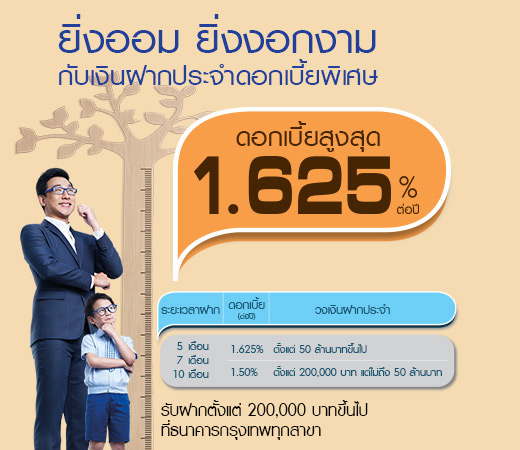 บัญชีเงินฝากประจำ 5 เดือน 7 เดือน และ 10 เดือน | 1.625% ต่อปี | ตั้งแต่ 50 ล้านบาทขึ้นไป |