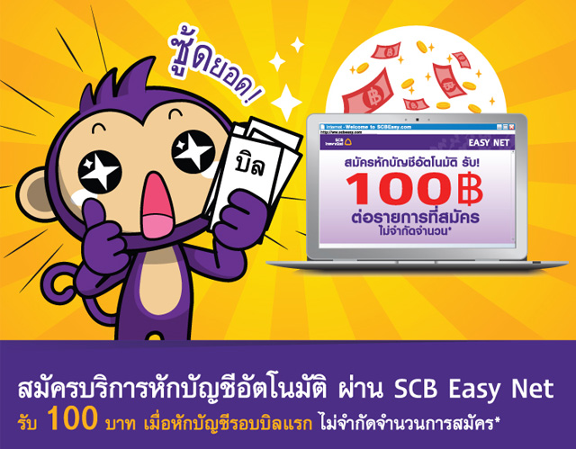 รับ 100 บาท เมื่อสมัครบริการหักบัญชีอัตโนมัติ SCB Easy Net และถูกหักบัญชีรอบบิลแรก