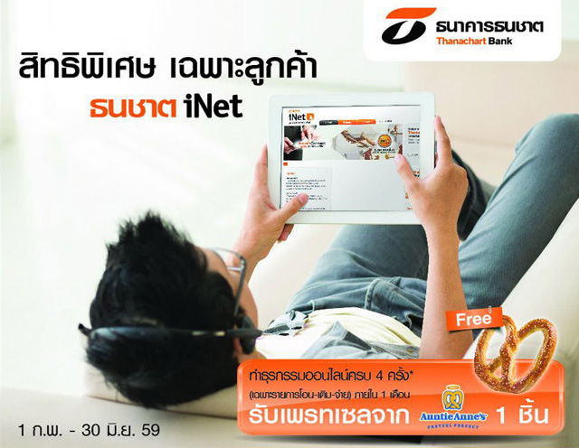 รับฟรี! เพรทเซล AuntieAnne's 1 ชิ้น สำหรับลูกค้าธนชาต iNET เมื่อทำธุรกรรมออนไลน์ครบ 4 ครั้ง เฉพาะรายการโอน, เติม, จ่าย ภายใน 1 เดือน เพียงแสดง SMS จากธนาคารฯ เพื่อรับสิทธิ์ได้ที่อานตี้ แอนส์ ทุกสาขาที่ร่วมรายการ