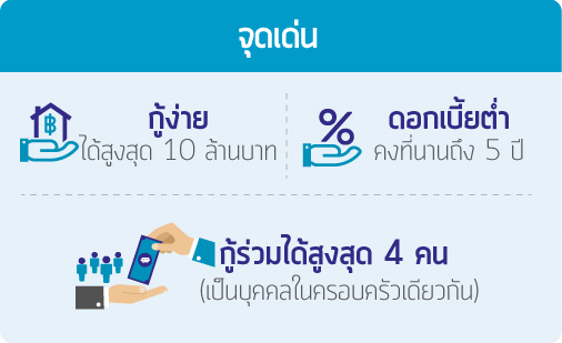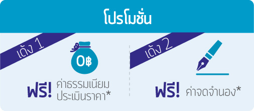 - เฉพาะลูกค้าที่ทำประกันชีวิตคุ้มครองวงเงินกู้ (MRTA) ตลอดระยะเวลากู้ทุนประกัน 100% ของวงเงินกู้ที่ได้รับอนุมัติกับธนาคาร ฟรีค่าธรรมเนียมประเมินราคาและค่าจดจำนอง
