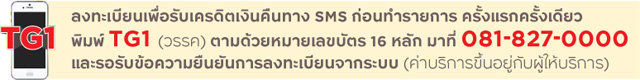 - เฉพาะสมาชิกบัตรที่ลงทะเบียน SMS ก่อนทำรายการ และได้รับข้อความยืนยันการลงทะเบียนสมบูรณ์แล้ว โดยเครดิตเงินคืนจะคำนวณจากยอดใช้จ่ายต่อรายการเท่านั้น