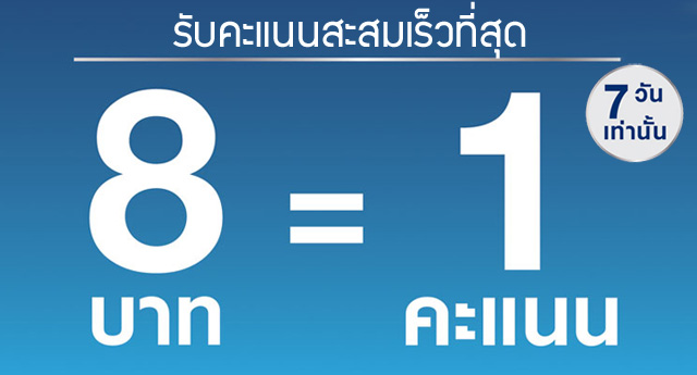7 วันเท่านั้น! รับคะแนนสะสมเร็วที่สุด พิเศษ 8 บาท = 1 คะแนน เมื่อมียอดใช้จ่ายในประเทศ ผ่าน