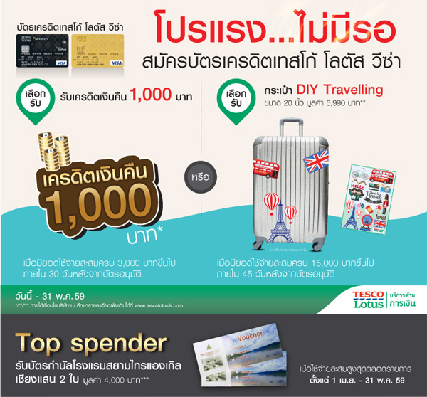 - สมาชิกใหม่จะได้รับกระเป๋าเดินทาง DIY รุ่นพิเศษ ขนาด 20 นิ้ว มูลค่า 5,999 บาท เมื่อมียอดใช้จ่ายสะสมครบ 15,000 บาทขึ้นไป ภายใน 45 วัน หลังจากบัตรอนุมัติ จำกัด 1 ใบ/ หมายเลขบัญชีบัตรหลัก ตลอดรายการ