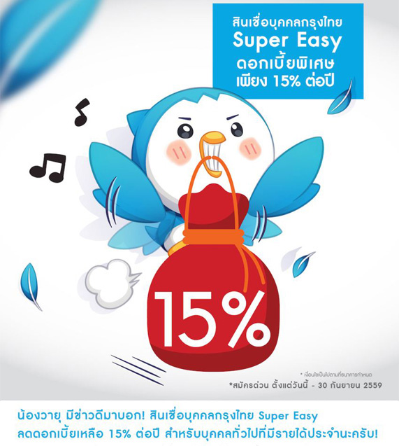 ข่าวดี! สินเชื่อบุคคลกรุงไทย Super Easy ลดดอกเบี้ยเหลือ 15% ต่อปี สำหรับบุคคลทั่วไปที่มีรายได้ประจำ สมัครด่วนตั้งแต่วันนี้ - 30 กันยายน 2559