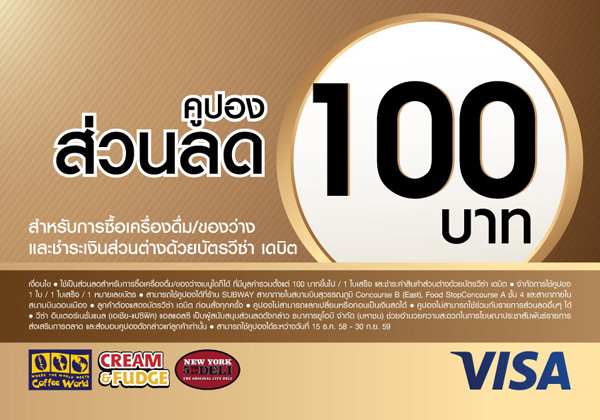 เงื่อนไขการใช้คูปองส่วนลด - คูปองใช้เป็นส่วนลดในการซื้อเครื่องดื่ม/ของว่างเมนูใดก็ได้ ที่มีมูลค่ารวมตั้งแต่ 100 บาทขึ้นไป ต่อ 1 ใบเสร็จ และชำระค่าสินค้าส่วนต่างด้วยบัตรวีซ่า เดบิต