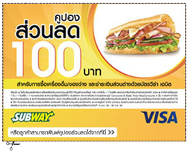 ท่องเที่ยวสุขใจ... พกบัตรยูโอบี วีซ่า เดบิต ทุกครั้งที่เดินทาง พร้อมรับสิทธิพิเศษ 2 ต่อ - พิเศษ 1 : ฟรี! คูปองส่วนลด มูลค่า 100 บาท สำหรับการซื้อเครื่องดื่ม/ของว่างเมนูใดก็ได้ ที่มีมูลค่าตั้งแต่ 100 บาทขึ้นไป และชำระส่วนต่างด้วยบัตรวีซ่า เดบิต ที่ Coffee World, New York 5th Avenue Deli, Cream & Fudge หรือ Subway
