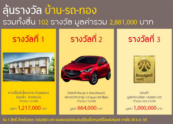 พร้อมลุ้นรางวัล บ้าน-รถ-ทอง รวมทั้งสิ้น 102 รางวัล มูลค่ารวม 2,881,000 บาท