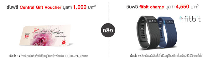 - รับ fitbit charge มูลค่า 4,550 บาท เมื่อได้รับอนุมัติวงเงินสินเชื่อและมีการโอนเงินสินเชื่อเข้าบัญชีของผู้สมัคร 250,000 บาทขึ้นไป ผู้สมัครสามารถรับ fitbit charge ได้ที่เคาน์เตอร์เซ็นทรัลเครดิต คาร์ด ทุกสาขา / สงวนสิทธิ์มอบของสมนาคุณสำหรับวงเงินสินเชื่อที่มีระยะเวลาการผ่อนชำระ 36 เดือนขึ้นไป และได้รับการโอนสินเชื่อแล้วเท่านั้น / บริษัทฯ ขอสงวนสิทธิ์ในการเปลี่ยนแปลงของสมนาคุณที่มีมูลค่าใกล้เคียงกันโดยมิต้องแจ้งให้ทราบล่วงหน้า / บริษัทฯ จะไม่รับผิดชอบต่อการสูญหายของสมนาคุณที่เกิดจากการจัดส่งให้บริการสินเชื่อโดย บริษัท เจเนอรัล คาร์ด เซอร์วิสเซส จำกัด