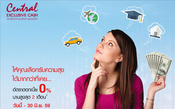 Central Exclusive Cash ให้คุณเลือกรับความสุขได้มากกว่าที่เคย ... อัตราดอกเบี้ย 0% นานสูงสุด 2 เดือน พร้อมสิทธิพิเศษเมื่อสมัครวันนี้ รับข้อเสนอสุดพิเศษ