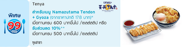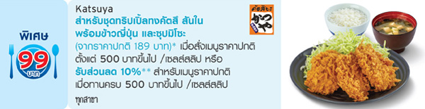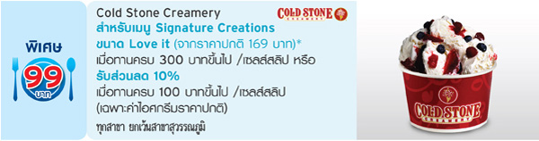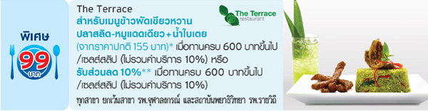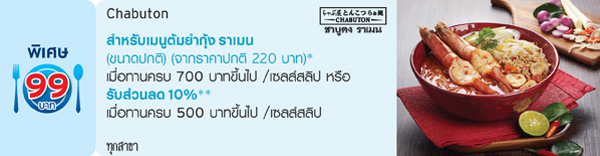 รับสิทธิ์แลกซื้อเมนูพิเศษในราคาเพียง 99 บาท หรือรับส่วนลด 10% (เฉพาะค่าอาหาร) ณ ร้านอาหารในเครือ CRG (Central Restaurants Group) จาก