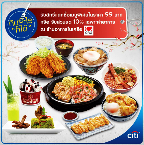 แลกซื้อเมนูพิเศษในราคา 99 บาท หรือรับส่วนลด 10% ณ ร้านอาหารในเครือ CRG จากบัตรเครดิตซิตี้ วีซ่า