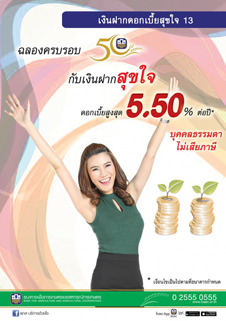 ธ.ก.ส. ฉลองครบรอบ 50 ปี กับบัญชีเงินฝากดอกเบี้ยสุขใจ 13 ให้อัตราดอกเบี้ยสูงสุด 5.50% ต่อปี สำหรับลูกค้าบุคคลธรรมดาไม่เสียภาษี เปิดบัญชีขั้นต่ำ 50,000 บาท