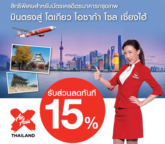 สิทธิพิเศษสำหรับผู้ถือบัตรเครดิตธนาคารกรุงเทพ รับส่วนลดสูงสุด 15% เมื่อซื้อตั๋วเครื่องบิน เส้นทางไปโตเกียว โอซาก้า โซล และเซี่ยงไฮ้ กับสายการบิน ไทย แอร์ เอเชีย เอ็กซ์ ในราคาปกติ ผ่าน Call Center ของ AirAsia โทร. 02-515-9999