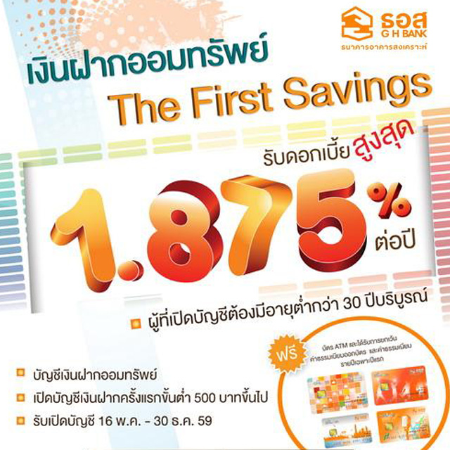 บัญชีเงินฝากออมทรัพย์ The First Savings สำหรับลูกค้าบุคคลธรรมดาที่มีอายุต่ำกว่า 30 ปีบริบูรณ์ อัตราดอกเบี้ยสูงสุด 1.875% ต่อปี เปิดบัญชีขั้นต่ำเพียง 500 บาท พิเศษ! เปิดใช้บริการบัตร ATM ฟรีค่าธรรมเนียมออกบัตร และค่าธรรมเนียมรายปีเฉพาะปีแรก