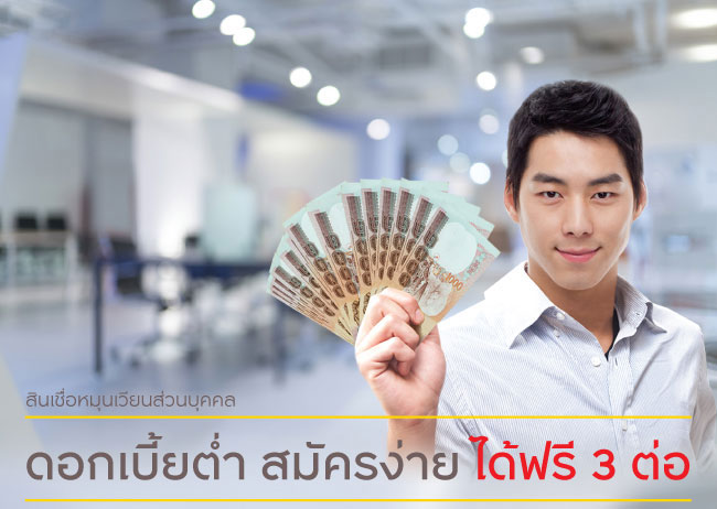 - อัตราดอกเบี้ย 12.99% ต่อปี 6 เดือนแรก สำหรับผู้มีรายได้ประจำต่อเดือนตั้งแต่ 30,000 บาทขึ้นไป อายุงานมากกว่า 2 ปี โดยได้รับอนุมัติวงเงินสินเชื่อตั้งแต่ 60,000 บาทขึ้นไป และรับเงินกู้โดยวิธีโอนเงินเข้าบัญชีเงินฝาก