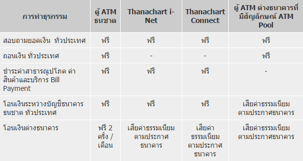 - ฟรี! โอนเงินทั่วประเทศระหว่างบัญชีธนาคารธนชาตที่ตู้ ATM ธนาคารธนชาต / Thanachart i-Net และ Thanachart Connect