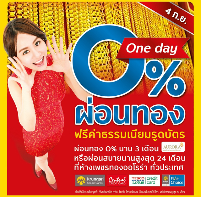 ผ่อนทอง 0% วันเดียว ฟรี! ค่าธรรมเนียมรูดบัตร.. ผ่อนทอง 0% นาน 3 เดือน หรือผ่อนสบายนานสูงสุด 24 เดือน ที่ห้างเพชรทองออโรร่า ทั่วประเทศที่ร่วมรายการ สิทธิพิเศษเฉพาะบัตรในเครือกรุงศรี