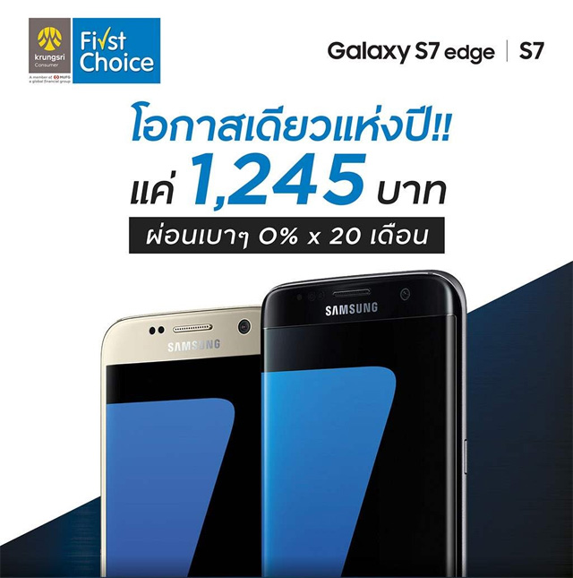 โอกาสเดียวแห่งปี!! กรุงศรี เฟิร์สช้อยส์ ให้คุณเป็นเจ้าของ SAMSUNG Galaxy S7 และ SAMSUNG Galaxy S7 edge ง่ายๆ... ผ่อนเบาๆ 0% นาน 20 เดือน เริ่มต้นเพียง 1,245 บาท เท่านั้น ณ ร้านค้าที่ร่วมรายการ