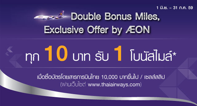 Double Bonus Miles, Exclusive offer by AEON ทุก 10 บาท รับ 1 โบนัสไมล์ เมื่อซื้อบัตรโดยสารการบินไทย 10,000 บาทขึ้นไป/ เซลล์สลิป ผ่านเว็บไซต์