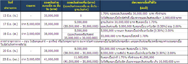 2. ลูกค้าจะได้รับดอกเบี้ยโบนัส ในกรณีที่มียอดเงินฝากส่วนเพิ่มในแต่ละวันเทียบกับฐานเงินฝากคงเหลือ ณ สิ้นวันที่ 1 มิถุนายน 2559 ตั้งแต่ 3 ล้านบาท - 10 ล้านบาท