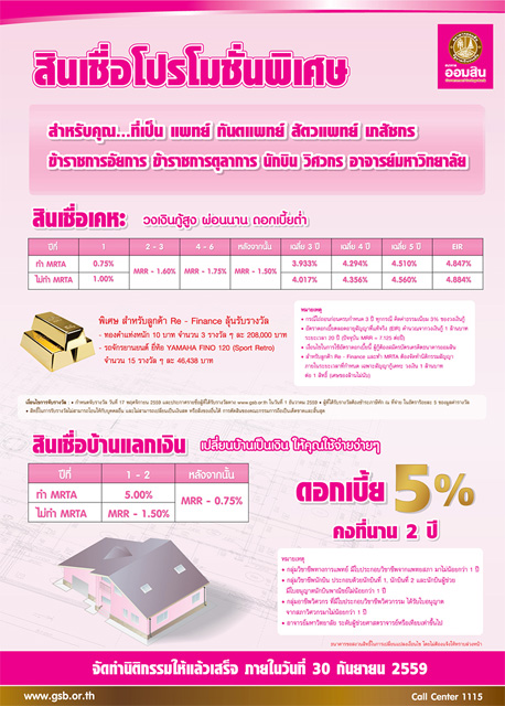 สินเชื่อเคหะ และสินเชื่อบ้านแลกเงิน จากธนาคารออมสิน มอบโปรโมชั่นพิเศษสำหรับ 9 กลุ่มวิชาชีพ ให้วงเงินกู้สูง ดอกเบี้ยต่ำ ผ่อนนาน พิเศษ! สำหรับลูกค้าสินเชื่อเคหะรีไฟแนนซ์ ลุ้นรับทองคำแท่งหนัก 10 บาท จำนวน 3 รางวัล และรถจักรยานยนต์ YAMAHA FINO 120 จำนวน 15 รางวัล