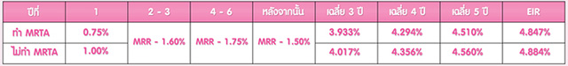 - อัตราดอกเบี้ยตลอดอายุสัญญาที่แท้จริง (EIR) คำนวณจากวงเงินกู้ 1 ล้านบาท ระยะเวลา 20 ปี (ปัจจุบัน MRR = 7.125% ต่อปี)