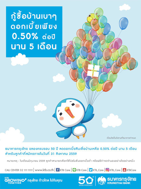 ธนาคารกรุงไทย ฉลองครบรอบ 50 ปี ลดดอกเบี้ยสินเชื่อบ้าน เหลือ 0.50% ต่อปี นาน 5 เดือน สำหรับลูกค้าที่ยื่นขอสินเชื่อภายในเดือนสิงหาคม 2559 พิเศษ! กรณียื่นขอสินเชื่อภายในเดือนมิถุนายนนี้ ฟรีค่าจดจำนอง 1%
