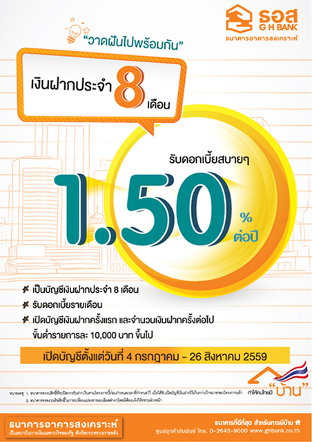 วาดฝันไปพร้อมกัน กับบัญชีเงินฝากประจำ 8 เดือน ให้คุณรับดอกเบี้ยสบายๆ 1.50% ต่อปี จาก ธอส.