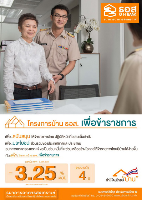 โครงการบ้าน ธอส. เพื่อข้าราชการ จากธนาคารอาคารสงเคราะห์ สร้างโอกาสให้ข้าราชการไทยมีบ้านได้ง่ายขึ้น ด้วยอัตราดอกเบี้ยเงินให้กู้ต่ำเพียง 3.25% ต่อปี นานถึง 4 ปี