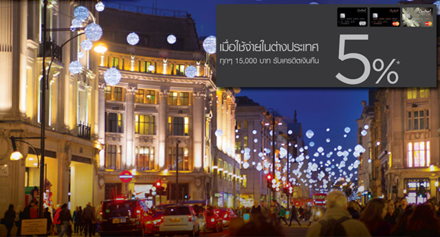 รับเครดิตเงินคืนสูงสุด 5% เมื่อใช้จ่ายที่ต่างประเทศ ทุกๆ 15,000 บาทขึ้นไป/ เซลล์สลิป สิทธิพิเศษเฉพาะสำหรับสมาชิก