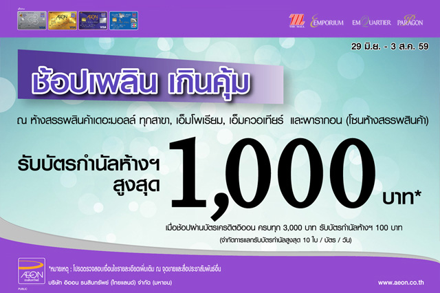 ช้อปเพลิน เกินคุ้ม! รับบัตรกำนัลสูงสุด 1,000 บาท เมื่อช้อปสินค้าครบทุก 3,000 บาท/ เซลล์สลิป รับบัตรกำนัลจำนวน 1 ใบ มูลค่า 100 บาท ณ ห้างสรรพสินค้าเดอะมอลล์ ทุกสาขา, เอ็มโพเรียม, เอ็มควอเทียร์ และพารากอน (โซนห้างฯ) ผ่าน