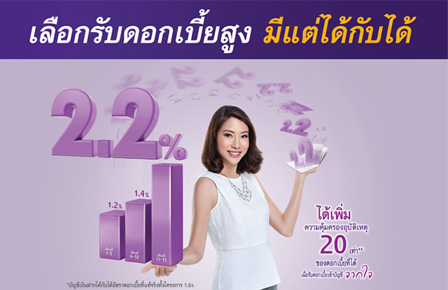 ใหม่! บัญชีเงินฝากประจำได้กับได้ (15 เดือน) จาก ธ.ไทยพาณิชย์ ให้ดอกเบี้ยแบบขั้นบันได สูงสุด 2.20% ต่อปี จ่ายดอกเบี้ยทุก 5 เดือน เปิดบัญชีขั้นต่ำ 50,000 บาท ฟรี! ประกันชีวิตจากอุบัติเหตุ คุ้มครองสูงสุด 20 เท่า* สูงสุด 10 ล้านบาท เมื่อเลือกรับดอกเบี้ยโดยโอนเข้าบัญชีเงินฝากจากใจ