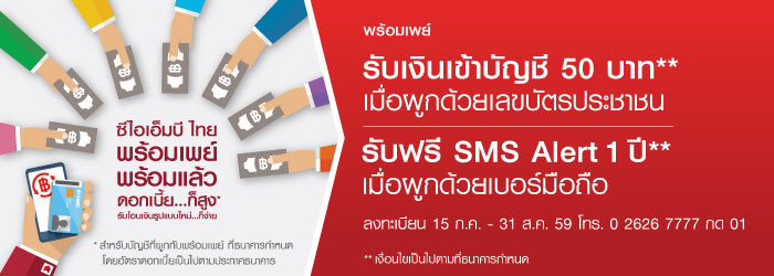ซีไอเอ็มบี ไทย พร้อมเพย์ พร้อมแล้ว...ให้คุณสนุกกับการเงินใหม่ที่ง่ายขึ้นทุกวัน รับ-โอนเงินระหว่างกันรูปแบบใหม่ช่วยให้การรับเงินโอนของคุณเป็นเรื่องง่าย และสะดวกยิ่งขึ้น ไม่ต้องจำ หรือบอกเลขบัญชีอีกต่อไป แค่ผูกบัญชี ซีไอเอ็มบี ไทย พร้อมเพย์ ด้วยเลขบัตรประชาชน และ/หรือเบอร์มือถือ แทนเลขที่บัญชีธนาคาร