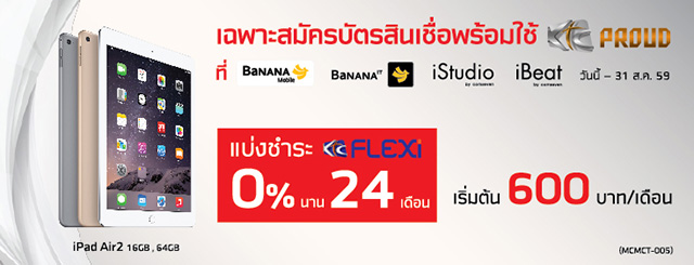 สมัครบัตรสินเชื่อพร้อมใช้ KTC PROUD เฉพาะร้านค้าที่ร่วมรายการวันนี้ รับสิทธิ์แบ่งชำระ iPad Air2 16GB, 64 GB ด้วย KTC FLEXI 0% นาน 24 เดือน เริ่มต้น 600 บาท/เดือน