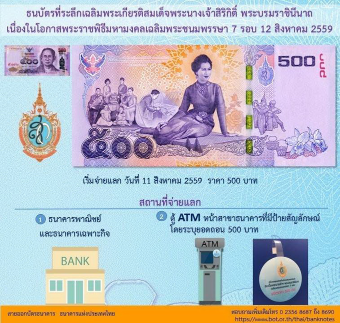 นายวิรไท สันติประภพ ผู้ว่าการธนาคารแห่งประเทศไทย (ธปท.) แถลงว่า เนื่องในโอกาสที่สมเด็จพระนางเจ้าสิริกิติ์ พระบรมราชินีนาถ ทรงเจริญพระชนมพรรษา 7 รอบ ในวันที่ 12 สิงหาคม 2559 นี้ ธปท. ได้จัดพิมพ์ธนบัตรที่ระลึก เพื่อร่วมเฉลิมพระเกียรติในโอกาสดังกล่าว