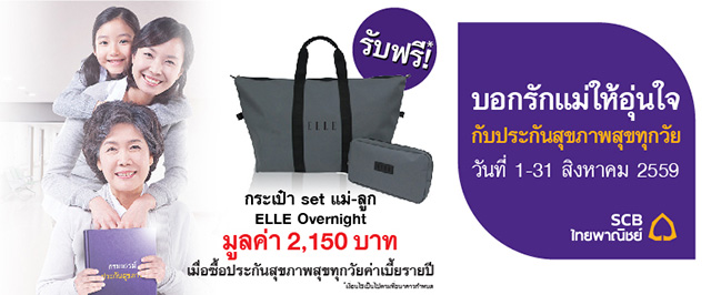 ธ.ไทยพาณิชย์ ชวนคุณมาบอกรักแม่ให้อุ่นใจ พร้อมรับฟรี! กระเป๋าเซตแม่-ลูก ELLE Overnight Bag มูลค่า 2,150 บาท เมื่อซื้อประกันสุขภาพสุขทุกวัย ค่าเบี้ยประกันรายปี คุ้มครองค่ารักษาพยาบาลทั้งกรณีผู้ป่วยในและผู้ป่วยนอกจากการบาดเจ็บหรือป่วย