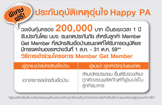 เงื่อนไขประกันอุบัติเหตุอุ่นใจ Happy PA - สิทธิพิเศษนี้เฉพาะลูกค้าที่ได้รับการแนะนำจากโปรแกรม Member Get Member ที่สมัครและได้รับการอนุมัติและจดจำนองระหว่างวันที่ 1 ส.ค. - 31 ต.ค. 59 เท่านั้น และต้องมีคุณสมบัติของผู้เอาประกันภัย ดังต่อไปนี้ อายุระหว่าง 15 - 60 ปี มีสุขภาพสมบูรณ์แข็งแรง ไม่มีส่วนหนึ่งส่วนใดของร่างกายพิการ และไม่คุ้มครองอาชีพ ดังต่อไปนี้ : คนงานก่อสร้าง/มอเตอร์ไซค์รับจ้าง / พนักงานส่งเอกสาร / ลูกเรือประมง /กู้ภัย / ยาม / ขุดเจาะน้ำมันหรือก๊าซธรรมชาติ / นักกีฬาผาดโผน / นักกีฬาอาชีพ / หัวคะแนน / นักการเมือง และอาชีพที่มีความเสี่ยงในระดับเดียวกัน