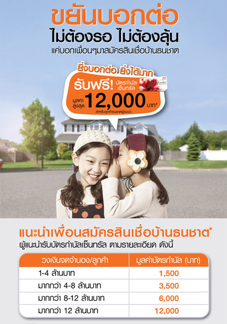 ขยันบอกต่อ ไม่ต้องรอ ไม่ต้องลุ้น แค่บอกเพื่อนๆ มาสมัครสินเช่อบ้านธนชาต รับฟรี! บัตรกำนัลเซ็นทรัล มูลค่าสูงสุด 12,000 บาท สำหรับลูกค้าธนชาตผู้แนะนำ และพิเศษ! วงเงินคุ้มครอง 200,000 บาท เป็นระยะเวลา 1 ปี สำหรับลูกค้า Member Get Member ที่ได้รับการอนุมัติและมีการจดจำนองภายใน 31 ต.ค. 59