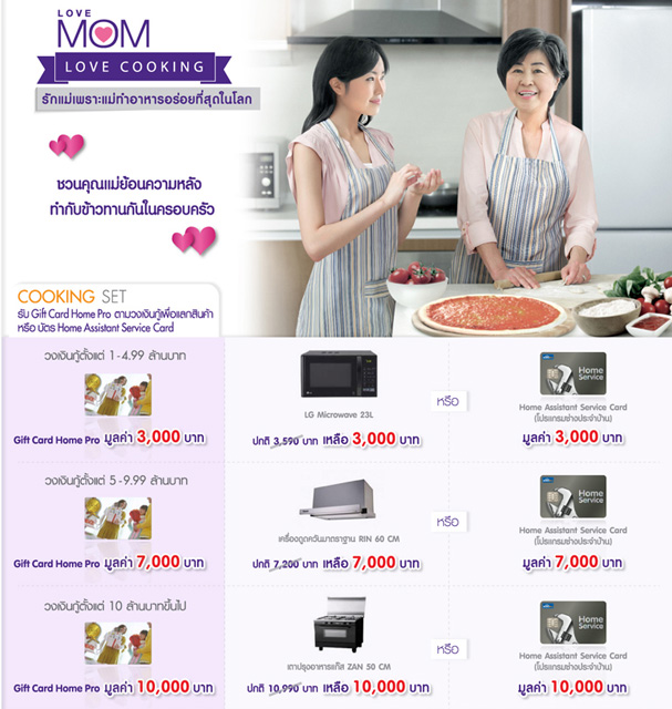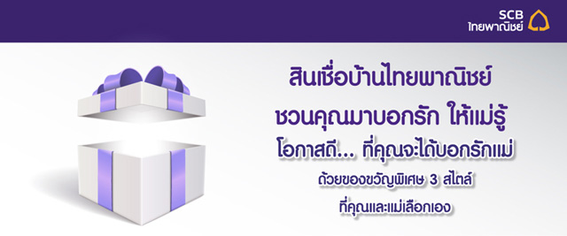 สินเชื่อบ้านไทยพาณิชย์ ชวนคุณมาบอกรัก ให้แม่รู้ โอกาสดี... ที่คุณจะได้บอกรักแม่ ด้วยของขวัญพิเศษ "Gift Card Home Pro" มูลค่าตามวงเงินกู้ สูงสุด 10,000 บาท เพื่อแลกซื้อสินค้า 3 สไตล์ ที่คุณและแม่สามารถเลือกได้เอง หรือเลือกรับบัตร Home Assistant Service Card (โปรแกรมช่างประจำบ้าน) มูลค่าเท่ากับบัตรกำนัลที่ได้รับ