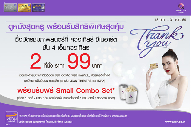 - สิทธิพิเศษสามารถใช้ได้ทุกโรงภาพยนตร์ใน Quartier CineArt, ศูนย์การค้า EmQuartier ชั้น 4 (ยกเว้น IMAX และ AEON THEATER)