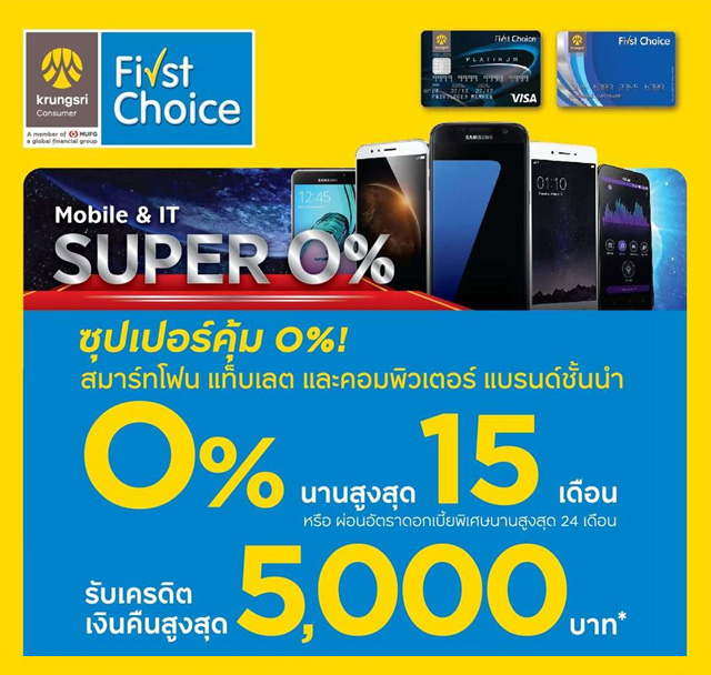 ผ่อนสมาร์ทโฟน แท็บเล็ต 0% นาน 15 เดือน พร้อมรับเงินคืนสูงสุด 5,000 บาท จากบัตรกรุงศรี เฟิร์สช้อยส์