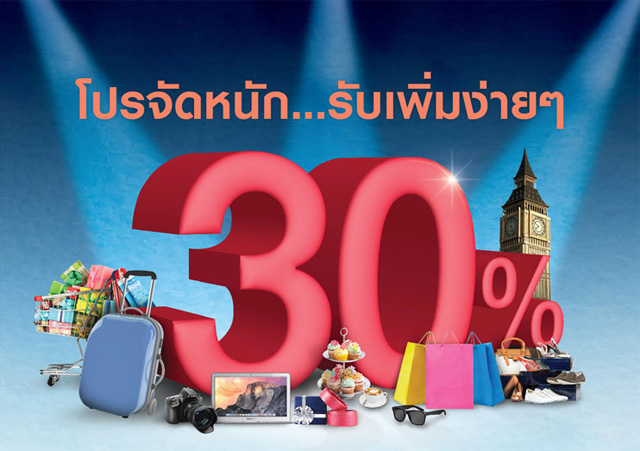 โปรจัดหนัก... รับคะแนนสะสมเพิ่ม 30% ง่ายๆ โดยไม่มีเงื่อนไขยอดใช้จ่ายขั้นต่ำ เมื่อใช้จ่ายในประเทศ หรือต่างประเทศผ่าน