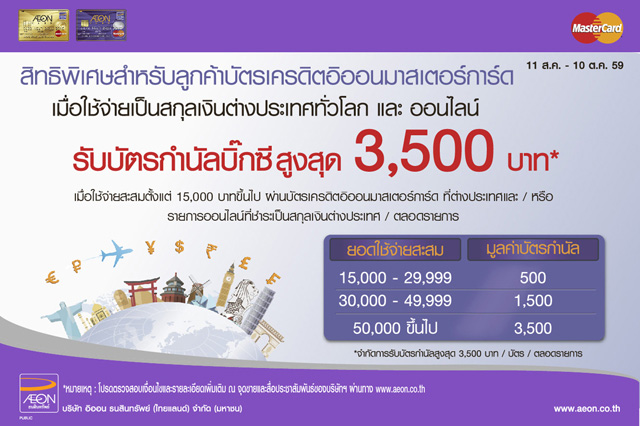 - สงวนสิทธิ์ในการมอบบัตรกำนัล Big C ให้เฉพาะสมาชิกบัตรเครดิตอิออนมาสเตอร์การ์ดที่มียอดใช้จ่ายสะสมในต่างประเทศ และ/หรือรายการออนไลน์ (E-Commerce ) ที่เลือกชำระค่าใช้จ่ายเป็นสกุลเงินตราต่างประเทศ และมีการเรียกเก็บเป็นสกุลเงินบาทในภายหลังตามอัตราแลกเปลี่ยนที่ MasterCard กำหนดตั้งแต่วันที่ 11 สิงหาคม 2559 - 10 ตุลาคม 2559 จำกัดมูลค่าบัตรกำนัลรวมสูงสุดไม่เกิน 3,500 บาท/ หมายเลขบัตร ตลอดรายการส่งเสริมการขาย