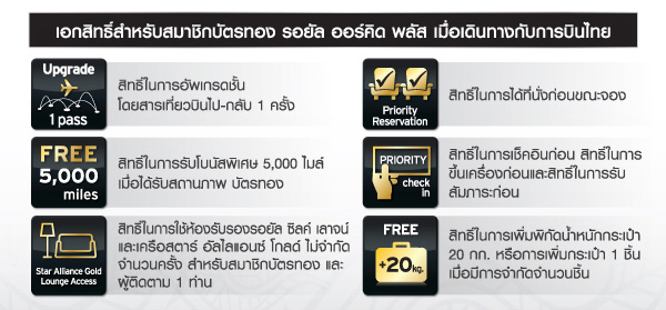 จะได้รับการอัปเกรดเป็นสมาชิกบัตรทอง รอยัล ออร์คิด พลัส เป็นเวลา 2 ปี และได้รับสิทธิพิเศษมากมายจากการบินไทย และสายการบินพันธมิตร ดังนี้