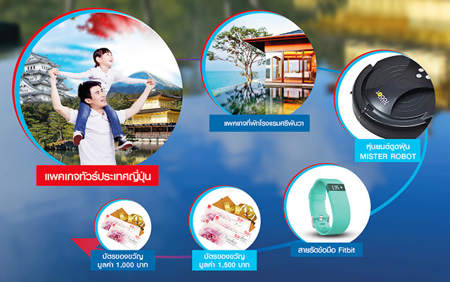 | 4,000,000 บาทขึ้นไป | รับฟรี แพคเกจทัวร์ประเทศญี่ปุ่น* พร้อมตั๋วเครื่องบิน 2 ที่นั่ง 5 วัน 3 คืน หรือ เลือกรับทองคำหนัก 1 บาท ทุกๆ ค่าเบี้ย 1 ล้านบาท (อย่างใดอย่างหนึ่ง) |